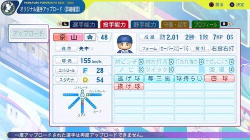 京山将弥(横浜DeNAベイスターズ) 投手 右投げ右打ち 近江高等学校→横浜DeNAベイスターズ(2017-) 2024年成績 23登板 防御率2.01 2勝1敗 パワナンバー 12400 40680 23677 能力について 奪三振…奪三振率8超え。今シーズンの投球はかなり良かった。 作成選手一覧…