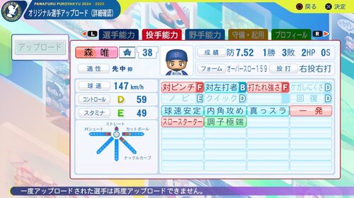 森唯斗(横浜DeNAベイスターズ) 投手 右投げ右打ち 徳島県立海部高等学校→三菱自動車倉敷オーシャンズ→福岡ソフトバンクホークス(2014-2023)→横浜DeNAベイスターズ(2024-) 14登板 防御率7.52 1勝3敗 唯一日本一を知る者 パワナンバー 12500 60620 77787 能力…