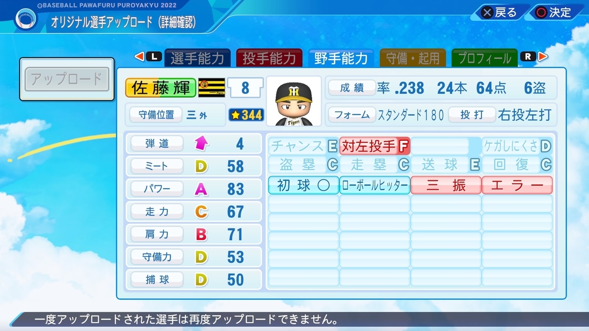 2022-05-14 佐藤輝明(2022)【パワプロ2022再現・パワナンバー】 選手作成 阪神タイガース パワプロ2022 佐藤輝明(阪神タイガース) 右投げ左打ち 三塁手・外野手・一塁手 仁川学院高等学校→近畿大学→阪神タイガース(2021-) 2022年成績(5月14日時点) 打率.284 7本 20打点 パワナンバー 11600 20228 00097 能力について リベンジとか付けても良かったかもしれない(今更) 作成選手一覧はこちらから。 pawahitta.hatenablog.com リクエストはこちらから。