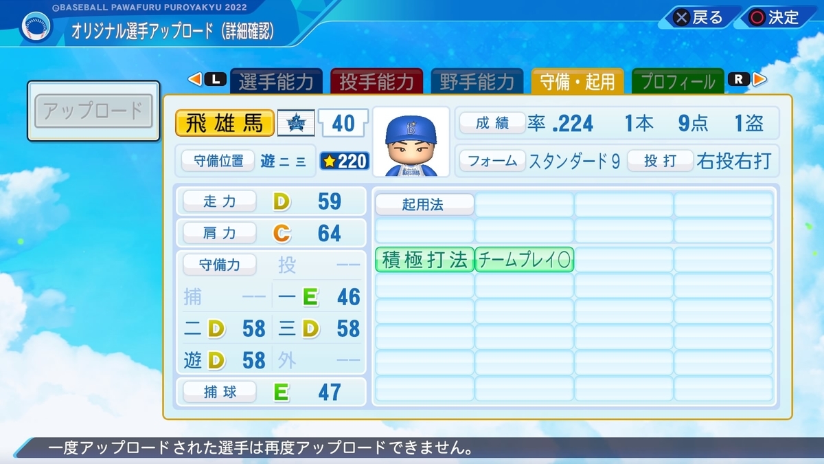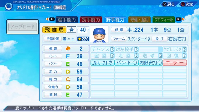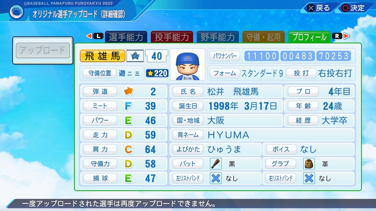2022-06-02 飛雄馬(横浜)【パワプロ2022再現・パワナンバー】 選手作成 横浜DeNAベイスターズ パワプロ2022 松井飛雄馬(元横浜DeNAベイスターズ) 二塁手・遊撃手・三塁手・一塁手 江の川高等学校→三菱重工広島→横浜DeNAベイスターズ(2012-2020) 横浜の星 2015年成績 打率.224 1本 9打点 飛雄馬の名を持つ内野手。 2015年は開幕1軍入りを果たし、59試合に出場。ショートに限らず二塁、三塁と多くのポジションを掛け持ちした。 ボールを割るようなフルスイングも魅力だったが、それ以上に守備のハンドリングの丁寧さ、流し打ちの精度の高さやバントなど、小技の上手さが目立った選手でもあった。 能力について ・巨人の星は読んだことがないというエピソードがあったりします。