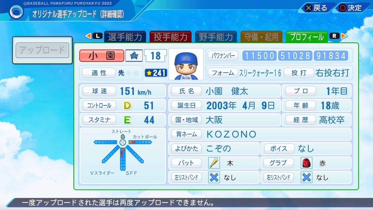 2022-11-04 小園健太(2022) 【パワプロ2022再現・パワナンバー】 2022横浜 パワプロ2022 横浜DeNAベイスターズ 選手作成 小園健太(横浜DeNAベイスターズ) 投手 右投げ右打ち 市和歌山高等学校→横浜DeNAベイスターズ(2022-) 二軍成績 防御率0勝0敗 パワナンバー 11500 51028 91834 ・査定については特には。球速が思ったより出ていたので安心した(こなみ) 作成選手一覧はこちらから。 pawahitta.hatenablog.com リクエストはこちらから。