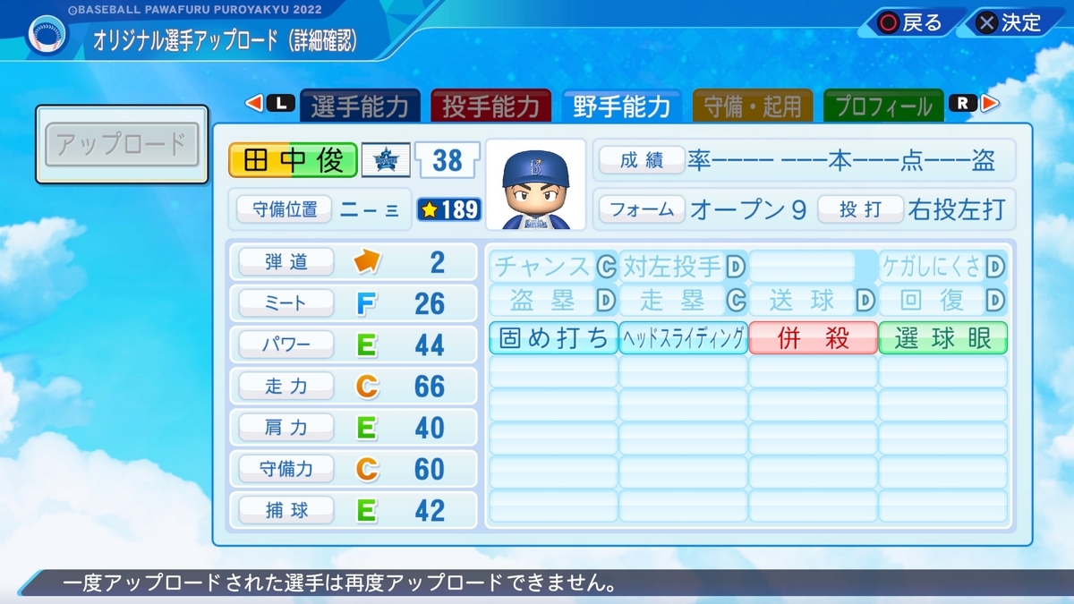 2023-10-22 田中俊太(2023)【パワプロ2022再現・パワナンバー】 選手作成 横浜DeNAベイスターズ パワプロ2022 2023横浜 田中俊太(横浜DeNAベイスターズ) 二塁手・一塁手・三塁手・遊撃手・外野手 右投げ左打ち 東海大学付属相模高等学校→東海大学→日立製作所→読売ジャイアンツ(2018-2020)→横浜ⅮeNAベイスターズ(2021-) 二軍成績 打率.243 0本 20打点 ops.631 パワナンバー 11800 92058 65653 能力について 特には。去年と二軍打率が全く一緒でびっくりしました。 作成選手一覧はこちらから。 pawahitta.hatenablog.com リクエストはこちらから marshmallow-qa.com