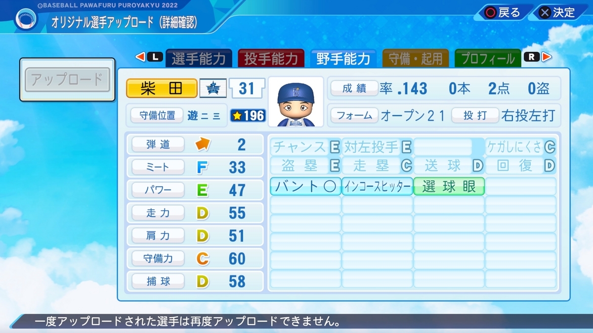 2023-11-13 柴田竜拓(2023)【パワプロ2022再現・パワナンバー】 2023横浜 選手作成 横浜DeNAベイスターズ パワプロ2022 柴田竜拓(横浜DeNAベイスターズ) 二塁手・遊撃手(三塁手) 岡山理科大学付属高等学校→國學院大學→横浜DeNAベイスターズ(2016-) 2023年成績 打率.143 0本 2打点 パワナンバー 11500 52103 60753 能力について インコース…後半からちょいちょい引っ張りの強い打球が見られたので、来年はワンチャン…と思ってます 作成選手一覧はこちらから。 pawahitta.hatenablog.com リクエストはこちらから marshmallow-qa.com